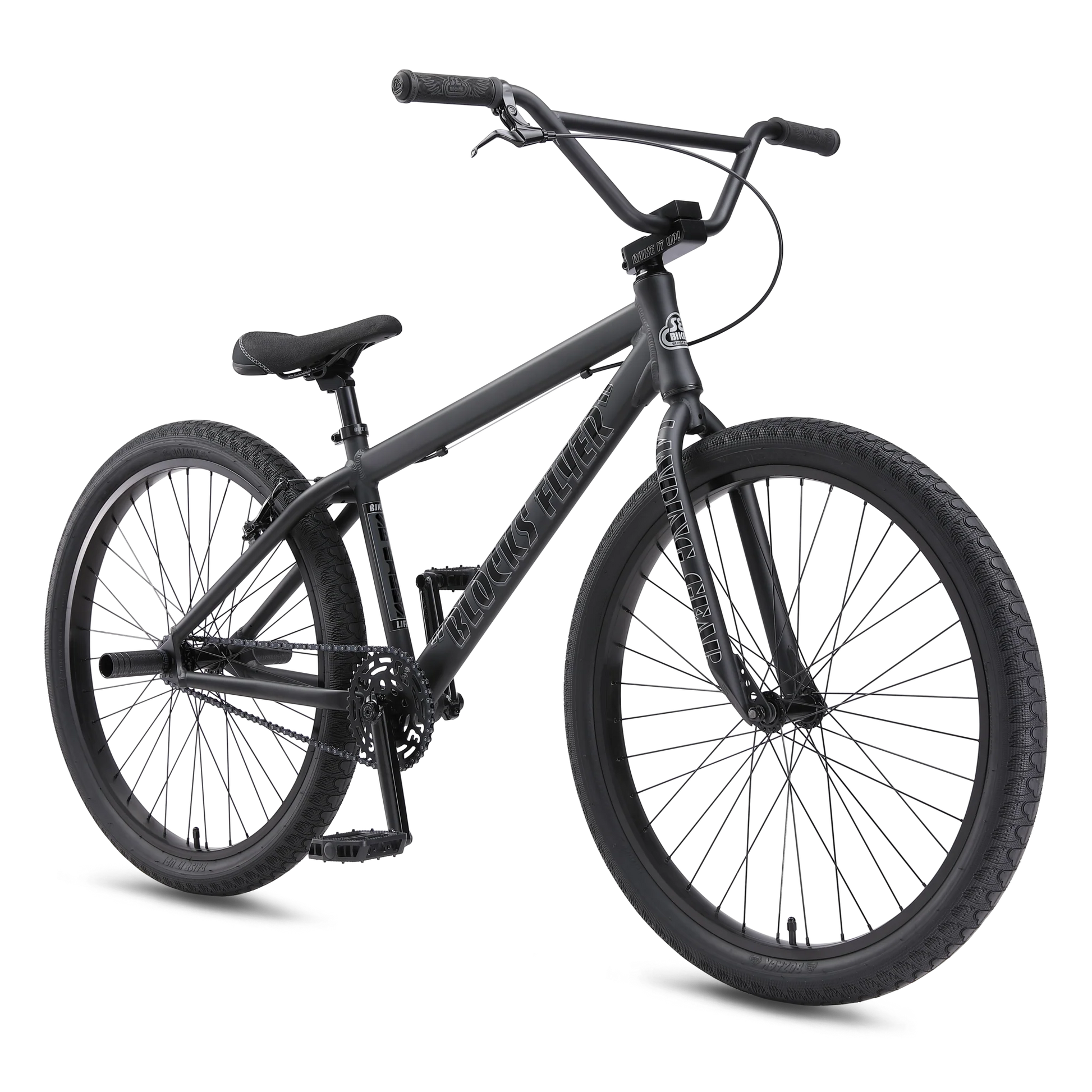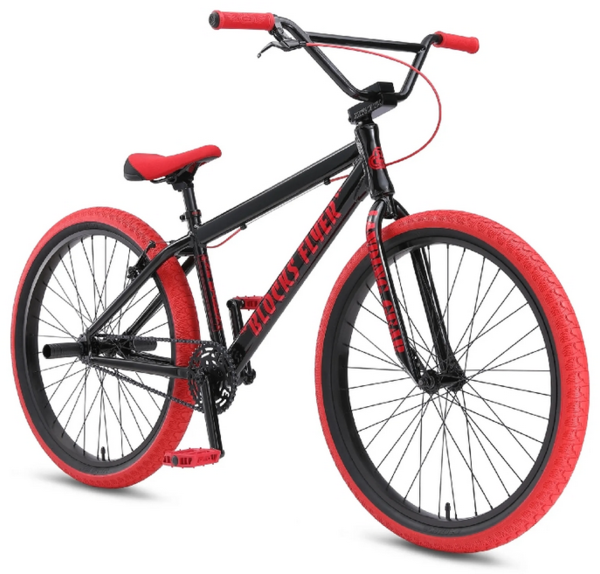Take a ride on the 26" Blocks Flyer, a bike that's built for bike life! The 6061 aluminum Floval tubing frame is strong and stylish, and the Promax V-brake provides stopping power and control during wheelies. The SE flangeless Mushroom Wing grips will surely give you a great feel on the bars. This bike also features SE Bozack tires with superior grip for swerves, along with Wheelie Pegs so you can wheelie for blocks and blocks!
